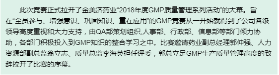 登场比赛充分展示了金美济员工GMP知识水平和朝气茎勃,积极向上的进取精神。鑫后,李海关总对本次比套作总结,他说道:“公司的可持续发展最终依掌的是质量管理团队提供的质呈保障,知识免我有利于员工学习交流和口氏提升,是提高田队凝聚力的有效途径。希望此关活动持填开展下去,并将其常态化,为进一步理解和海立GMP管理、稳主并逐步将开公司产品质量,打造金辨品属名实基础。”知识竟赛展风采 ,创新岁戏新起航。让我们以此次GMP知识竟赛为契机,立足本把忍向,影地古记,汽武西,罪仲都色,四他,也-西的标杆企业的运路上!